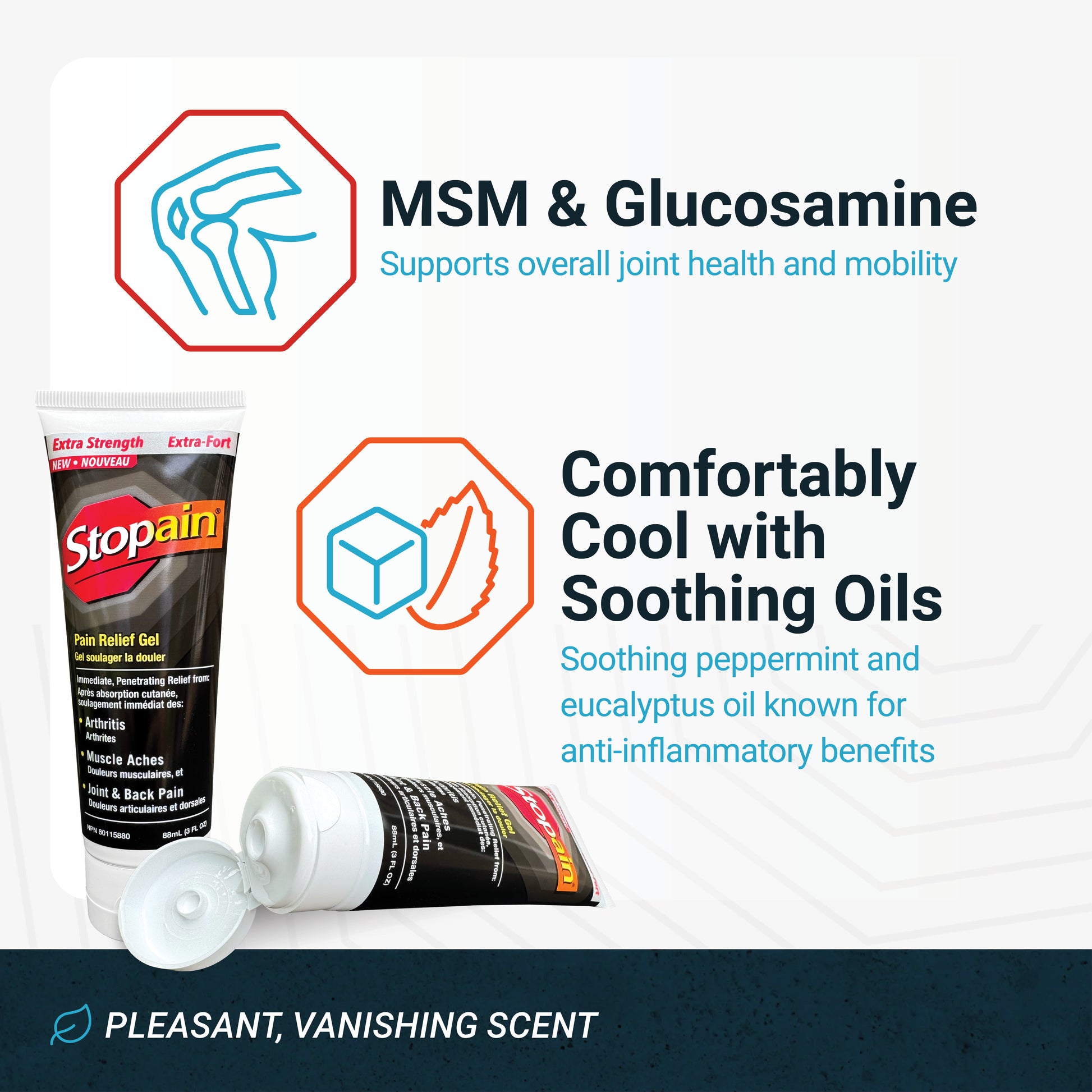 Le gel Stopain Extra Strength est formulé avec 8 % de menthol, plus du MSM et de la glucosamine